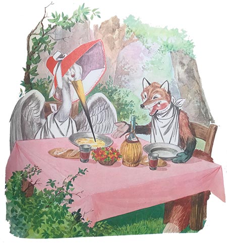 The poor stork, however, was left speechless: his plate was wide and shallow, so he could barely dip the tip of his beak into the broth. He couldn’t swallow a drop!