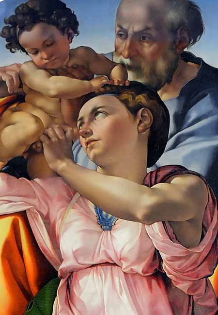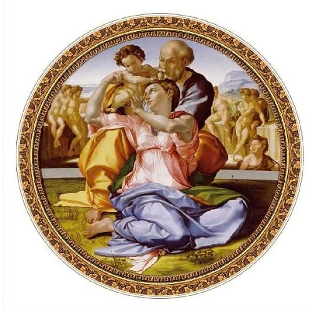 The Doni Tondo is the only completed panel painting by the great Renaissance artist Michelangelo Buonarroti. In fact, only two other panel paintings, generally believed to be by Michelangelo but unfinished, complete Michelangelo’s pictorial collection: the Deposition and the so-called Manchester Madonna, both exhibited at the National Gallery in London.