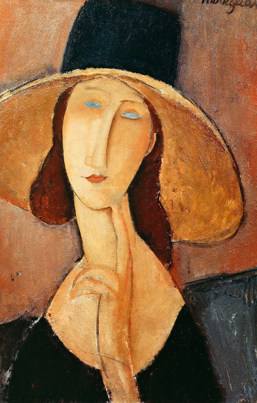 The painting showing her wearing a wide-brimmed hat, which seems to isolate her from her surroundings and almost protect her, dates back to 1918. The pensive pose that distinguishes her, with two fingers raised to her chin, is rendered melancholy by the tilt of her head, as in Botticelli ‘s paintings and drawings. Her pupilless eyes are two clear slits that reveal to the observer the inner life of Jeanne, a passionate woman and the artist’s sensitive companion.