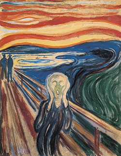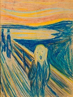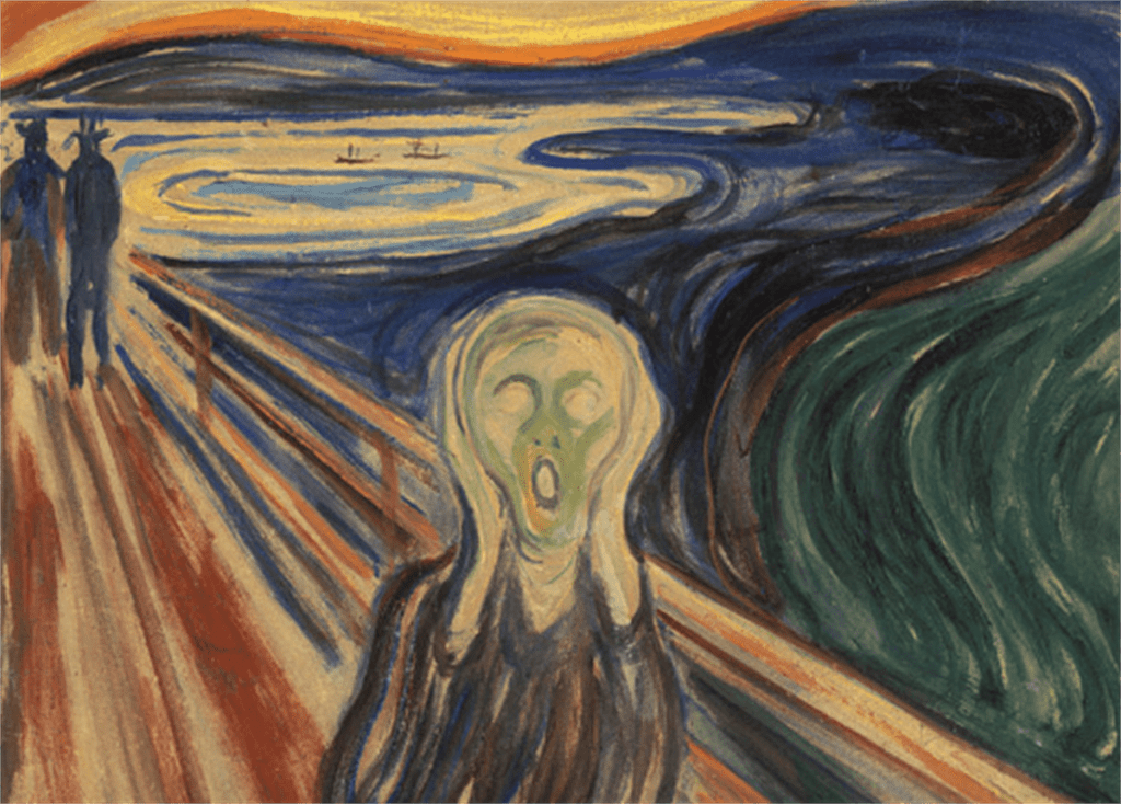 This painting is the emblem of emotional exploration , profound inner solitude, and the tumultuous journey undertaken in the search for serenity amid the difficulties of illness and death. An inner scream, terrified by a fiery sky, is expressed on canvas in one of the greatest works in the history of art.