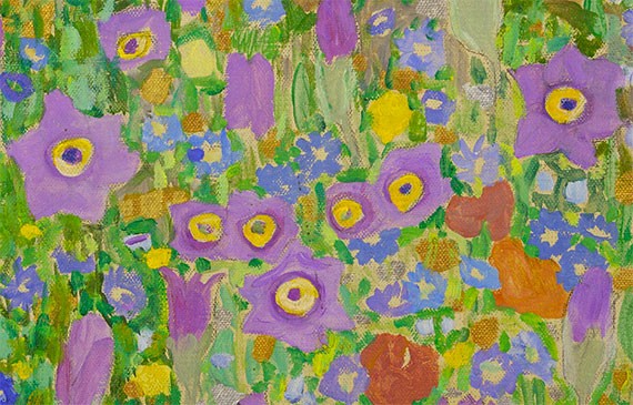 A strip of flowery meadow provides a visual anchor, while the rest of the background is rendered, in a technique Klimt also uses in the contemporary Portrait of Adele Bloch-Bauer , as a sky dotted with golden flecks.