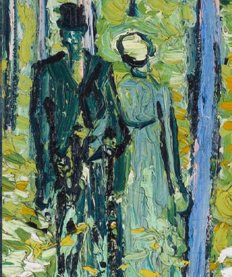 The couple wears clothes that are very reminiscent of those worn by Parisians during the holidays: it is worth noting that during the holidays it was common to go for walks in the numerous parks or natural spaces both within and near the capital to relax.